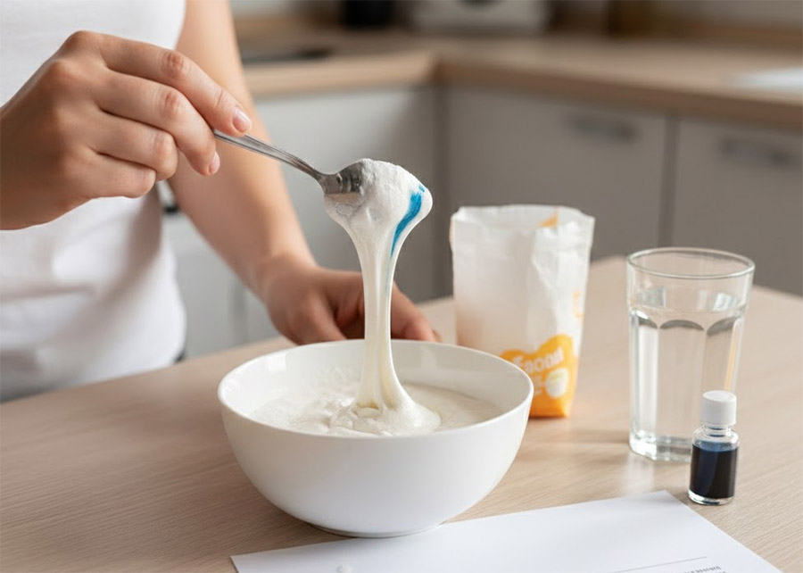 Если слайм слишком жидкий или расползается — вмешайте небольшое количество крахмала. Он быстро уплотняет текстуру. - Добавьте сахар или соль.
